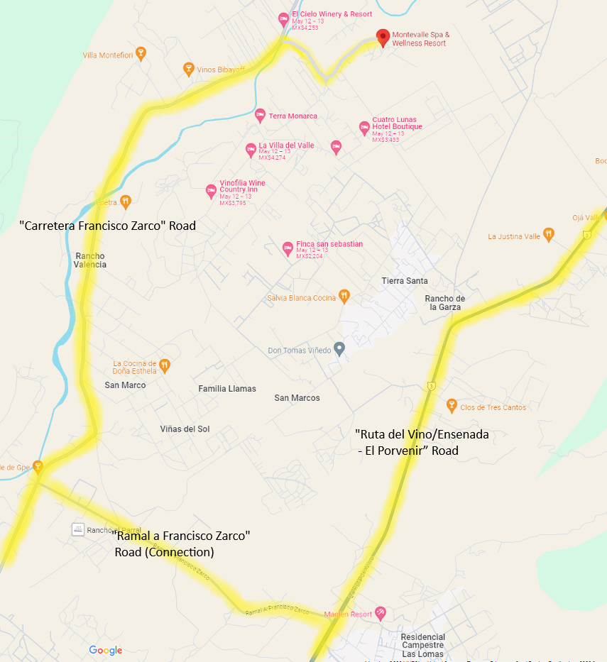 “El Cielo”. Si se encuentra en la carretera “Ruta del Vino/Ensenada El Porvenir”, NO intente conectar con Montevalle por la carretera “Tierra Santa” ni por ninguna otra alternativa. Utilice únicamente la conexión “Francisco Zarco”.